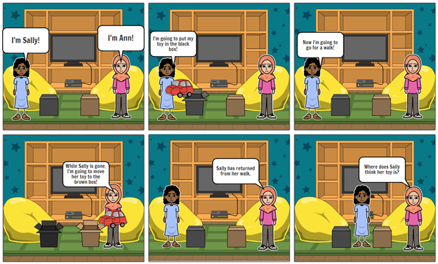 Sally hides a toy in one place (the black box), and then she leaves the room. While Sally is gone, Ann moves the toy. Children are asked where Sally will look for her toy when she gets back.